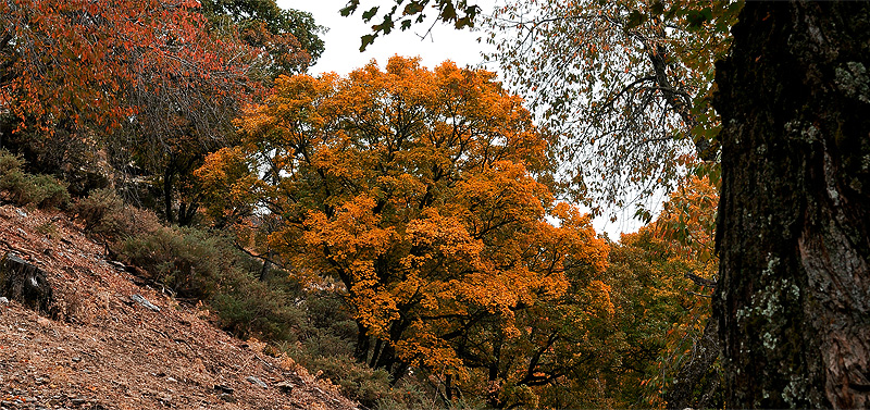 Sierra Nevada ofrece al viajero que la visita en otoño, otra serie de árboles de hoja caduca, muy interesantes por sus tamaños formas y tipos, muchos de los cuales ofrecen, al igual que los álamos, espectaculares coloraciones otoñales. |