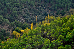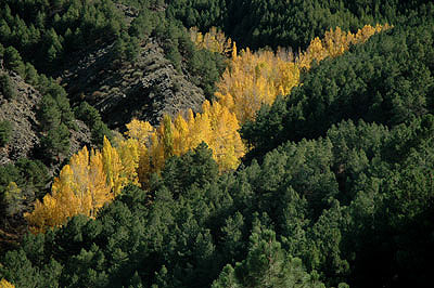 Espectacular ciclo de vida y muerte Los pinares y alamedas que se esparcen por los pequeños barrancos de la zona media de Sierra Nevada, entremezclan su colorido, transfiriendo al paisaje un fuerte aroma de descomposición de las hojas. Hojas que una vez putrefactas, serán semilla para la vida en la próxima primavera. |
